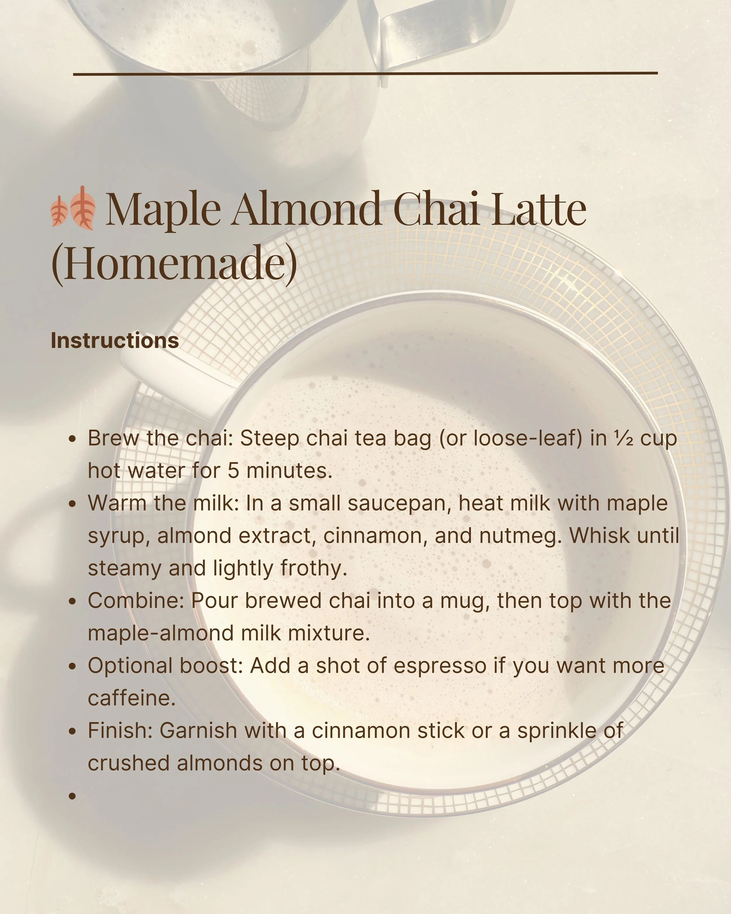 When I had a craving for Starbucks Chai Tea Latte the other week, but learned the sugar content in a single serving, I knew I had to do something about it. So I dreamed up this maple almond chai latte and it is so similar to the classic but a fraction of the sugar.