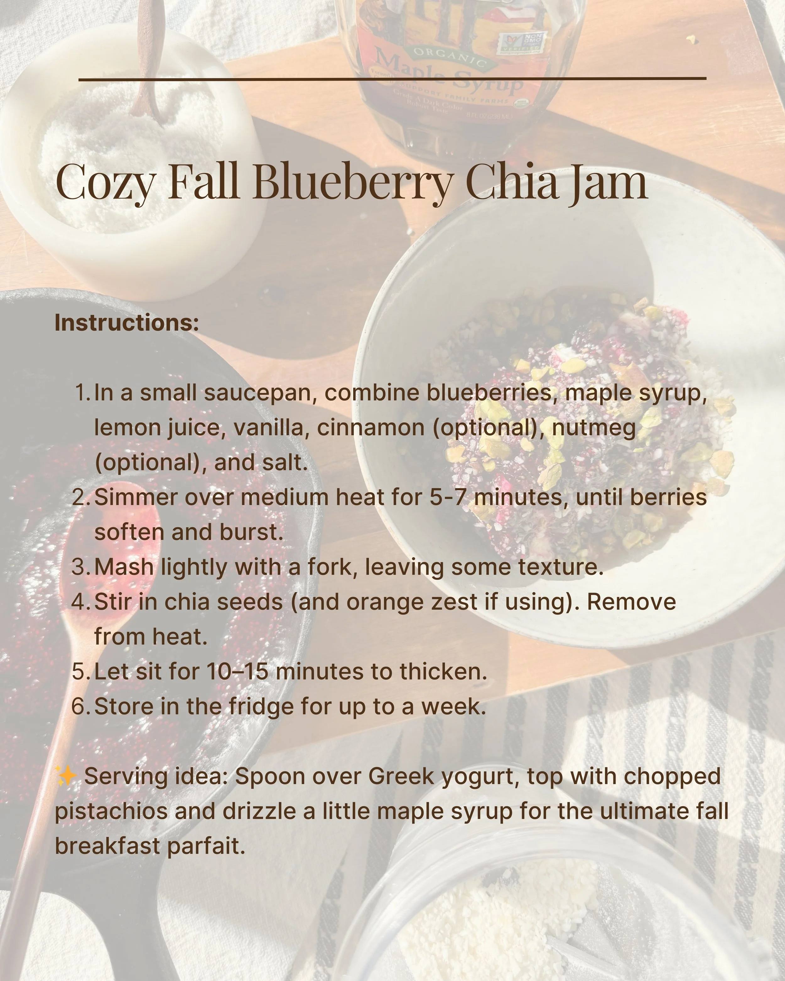 This jam is the perfect amount of warmth and depth for those cooler fall mornings. Simple to make, you could really swap out for any berry- raspberry, strawberry, etc- and adds a richness to yogurt or toast.
