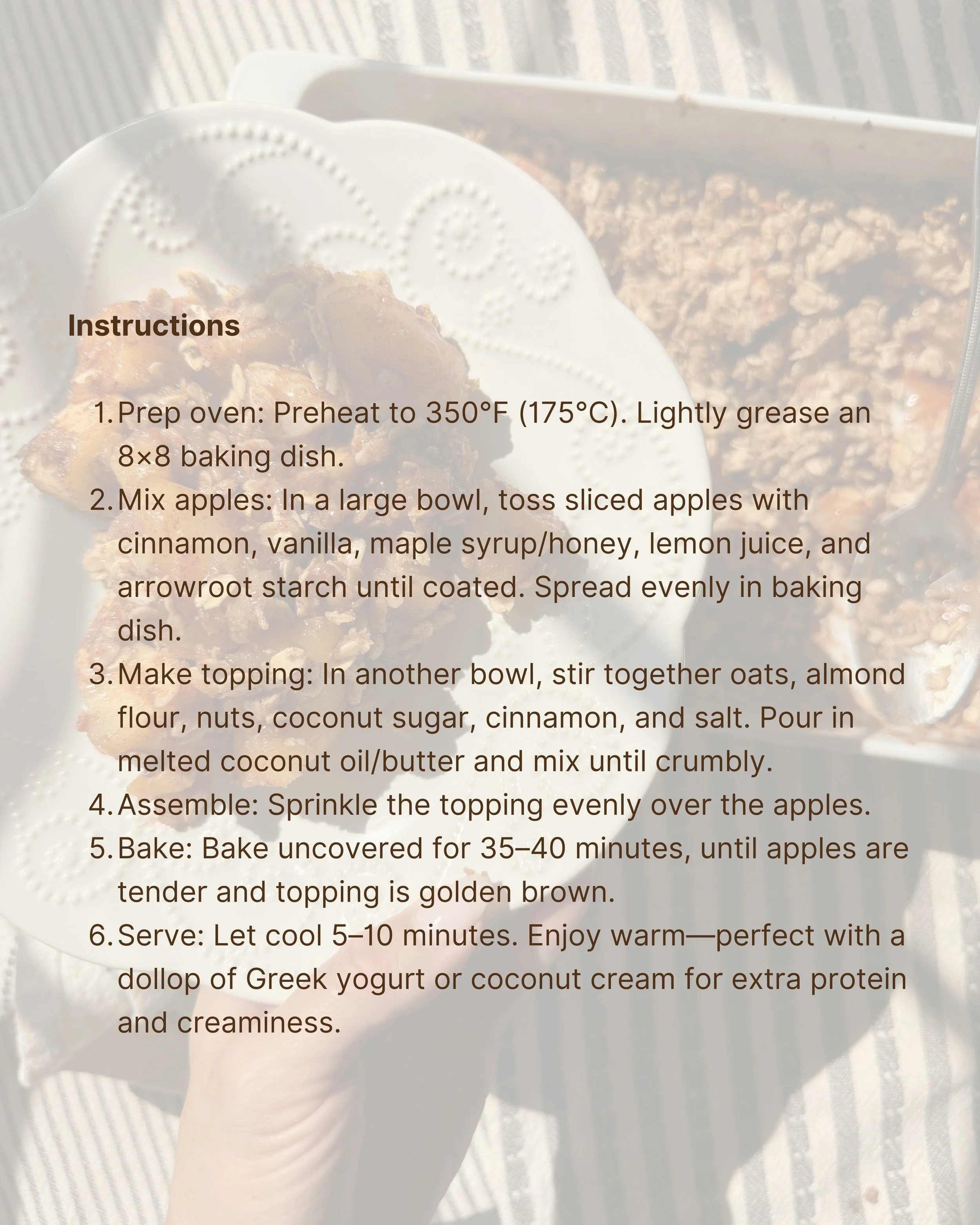 The most traditional of the fall recipes! This apple crisp is healthy, using natural sugars, and absolutely delicious! The flavors speak for themselves.